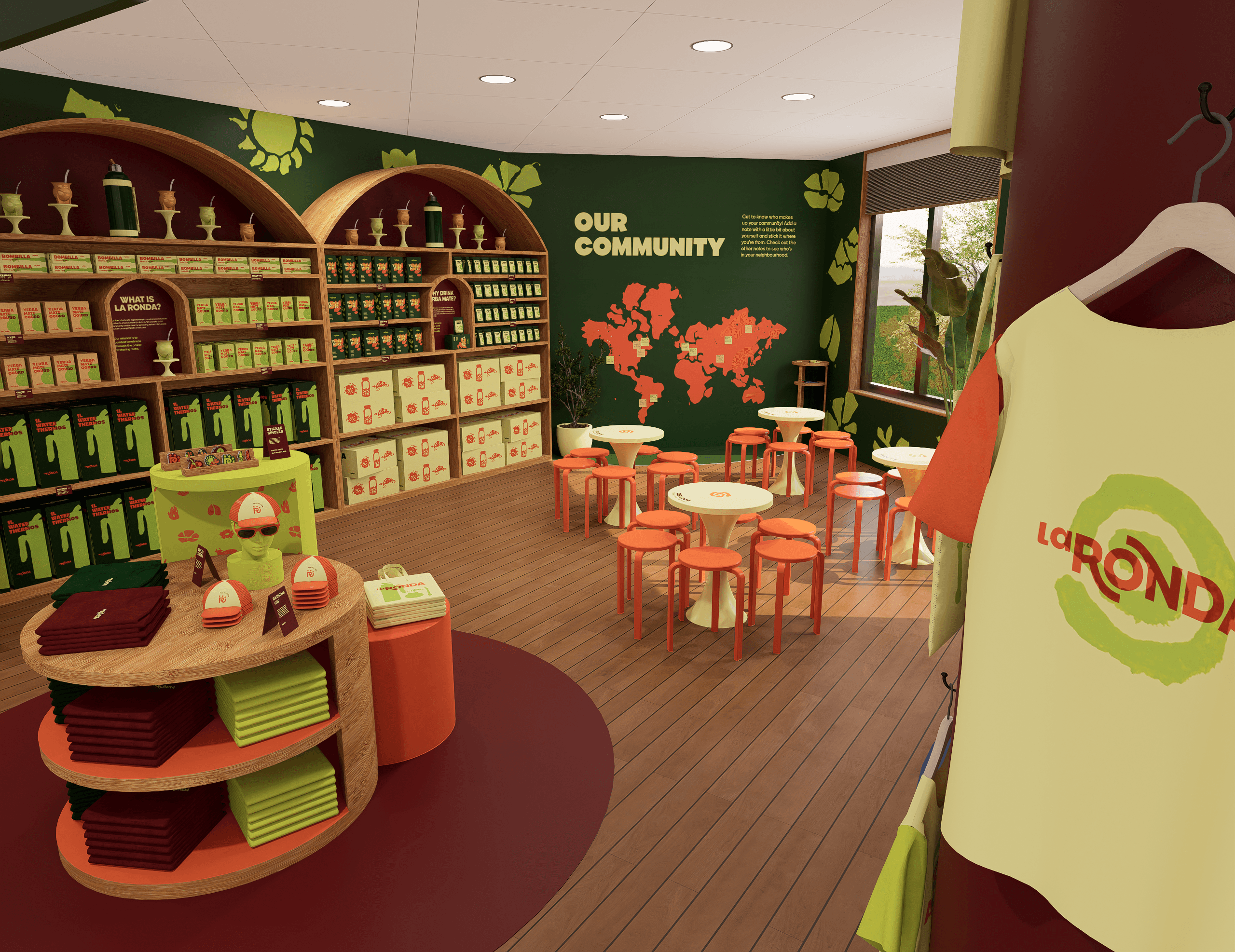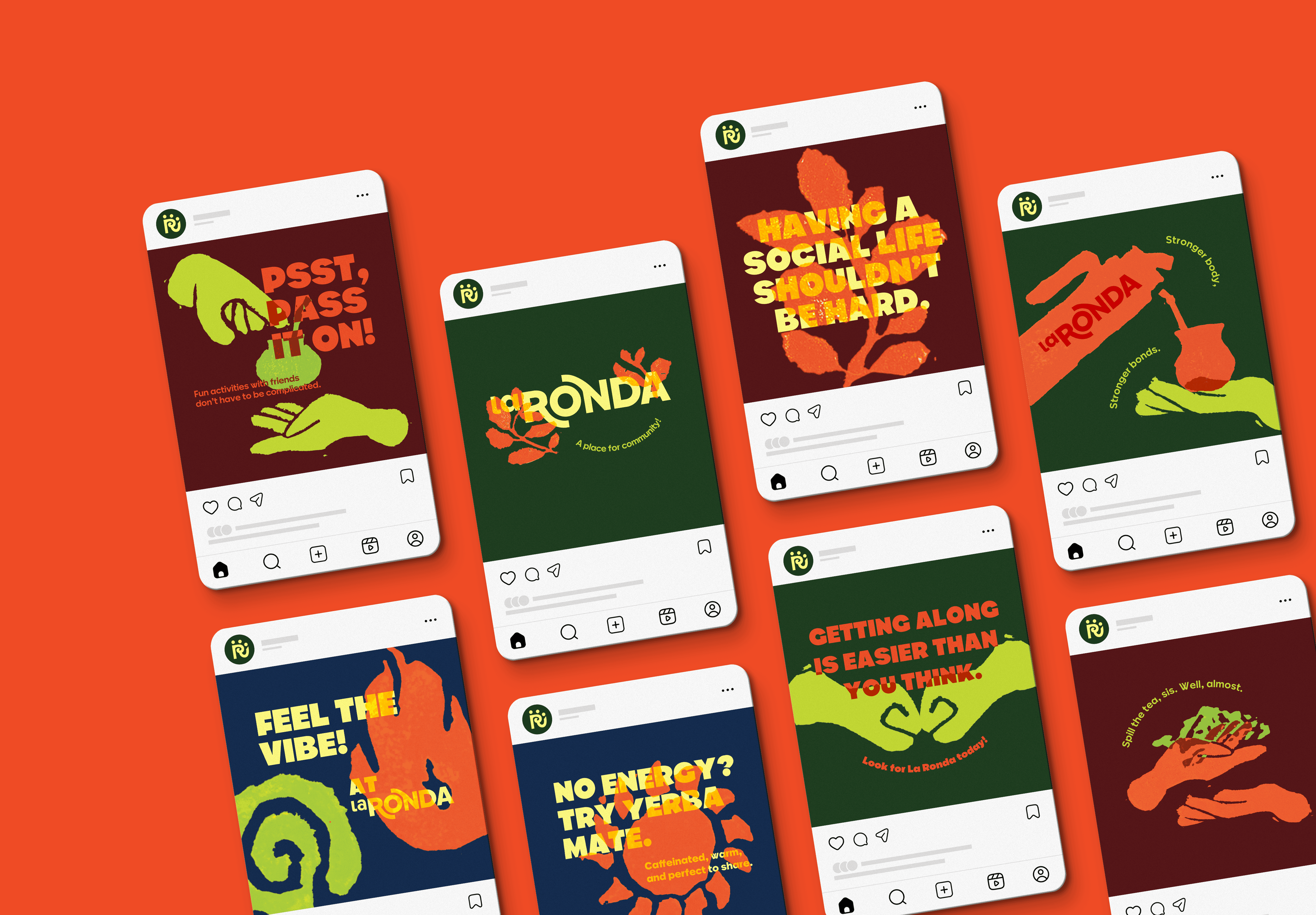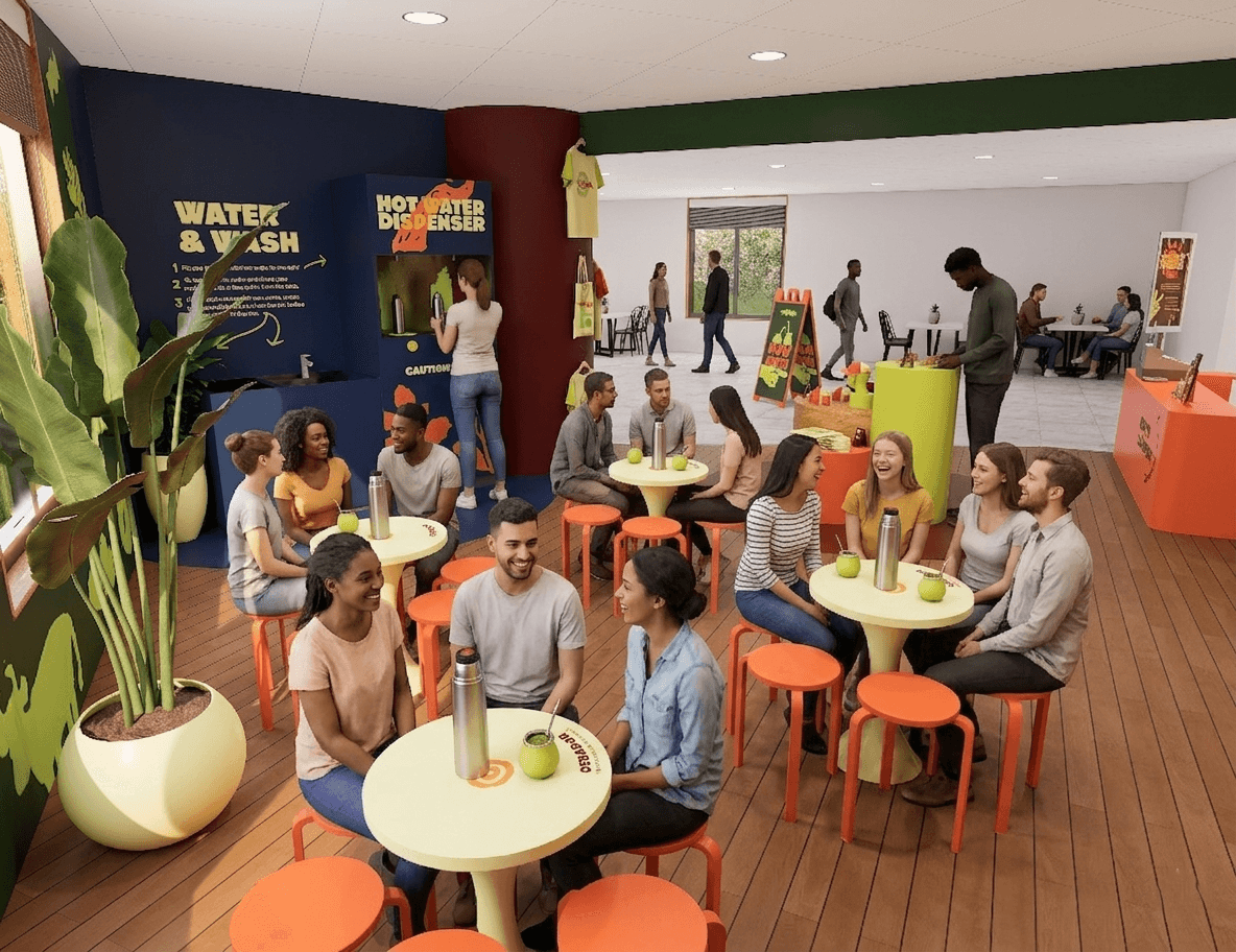 La Ronda is an initiative to fight social isolation in working North Americans through the introduction of Argentina’s vibrant sharing culture of yerba mate (mah-tay). North Americans have no time or energy to plan social activities due to demanding work schedules, leading to phone addictions and overall poor health. Yerba mate is a loose-leaf tea that you brew as you drink, an accessible activity for bonding with your friends. A ronda refers to the circle that forms for chatting and sharing mate. With La Ronda, you can build one of these social rondas anywhere. While it’s meant to be enjoyed wherever is convenient, there’s an opportunity to foster deeper community connections and create brand awareness, which inspired the design of community centre pop-ups for hosting community events.